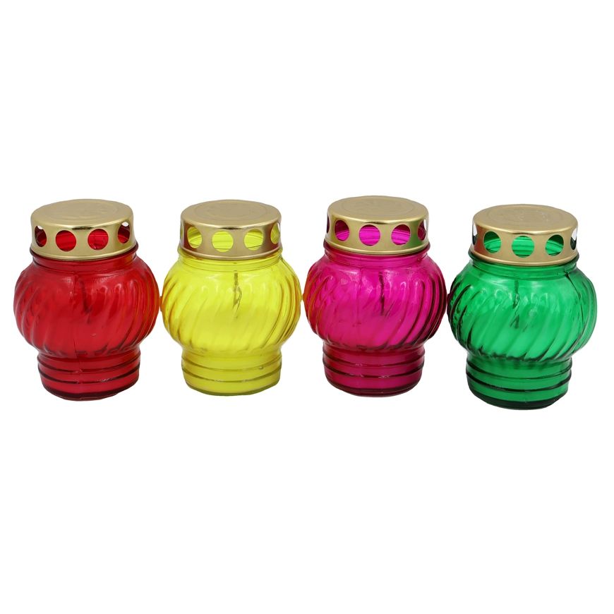 Svece ar jumtiņu stikla traukā (12h) H11cm Ø7cm krāsainas
