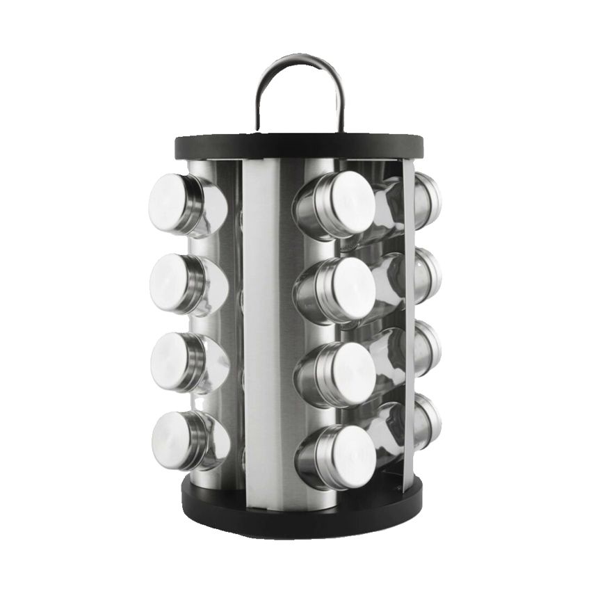 Materiāls: nerūsējošais tērauds. Stikla trauki Komplektā ietilpst: – 16 konteineri – rotējošs statīvs Izmēri: augstums 18 cm, garums 17 cm, platums 17 cm |